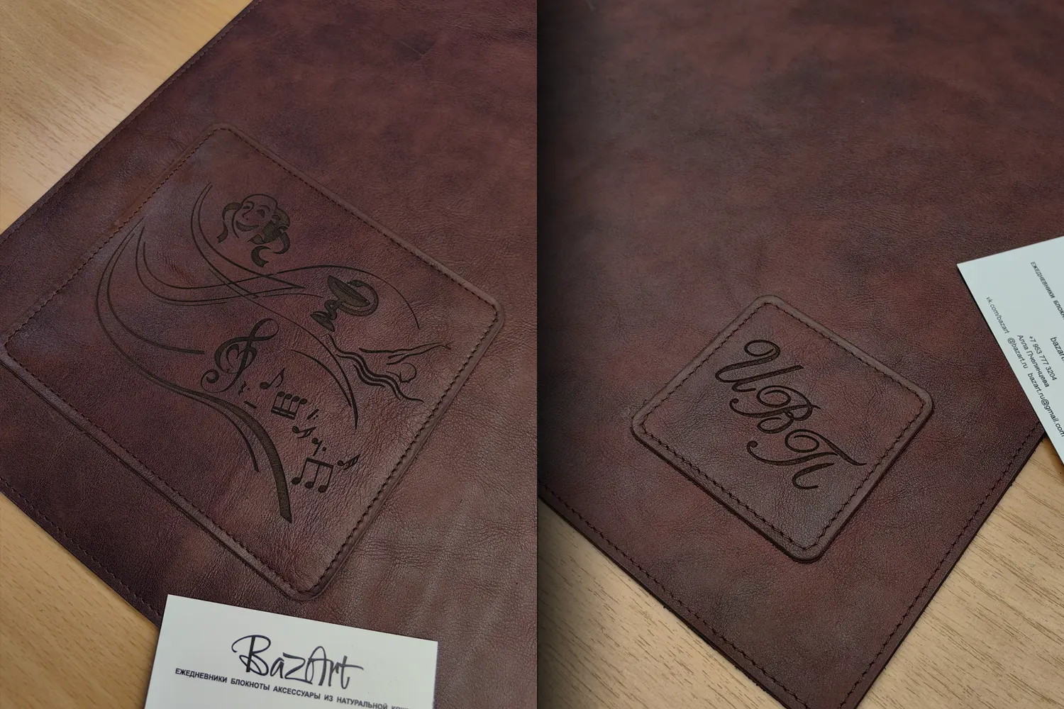 На бюваре две нашивки с гравировками. На одной символы хобби владельца, на второй инициалы.