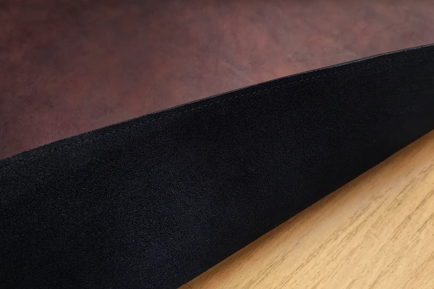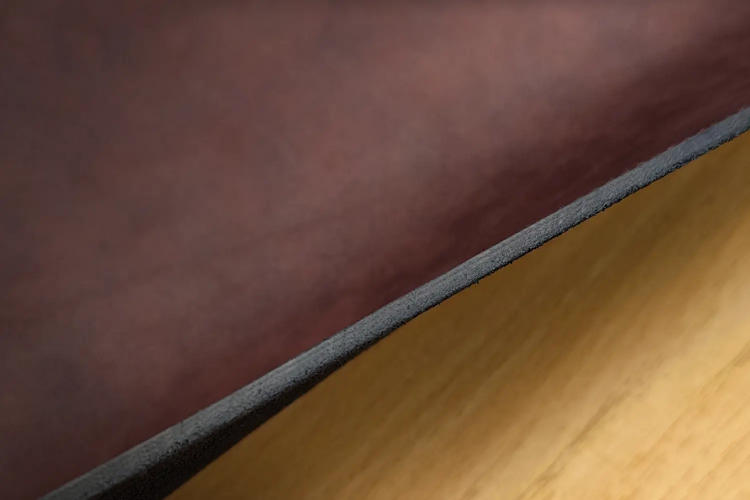 Сделан из двух слоев натуральной кожи. Лицевой слой гладкая кожа цвета красного дерева с неравномерным окрасом.