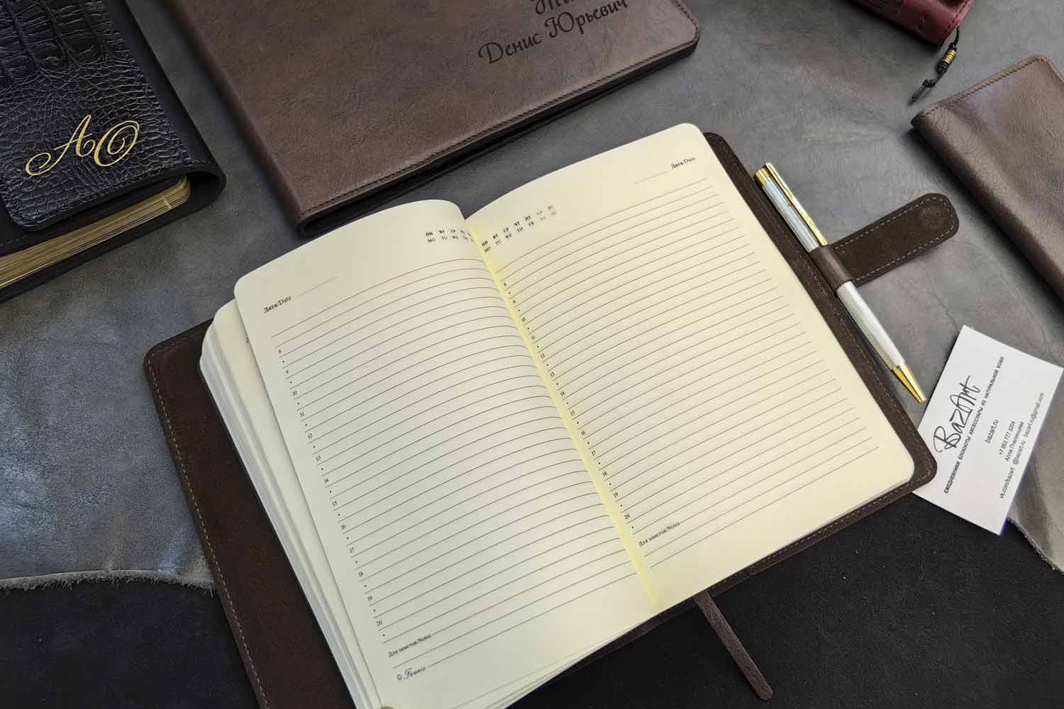 Гравировка внутри и страницы. Страницы обычно линованые недатированные, по запросу сделаем и датированные, и чистые, и именные.