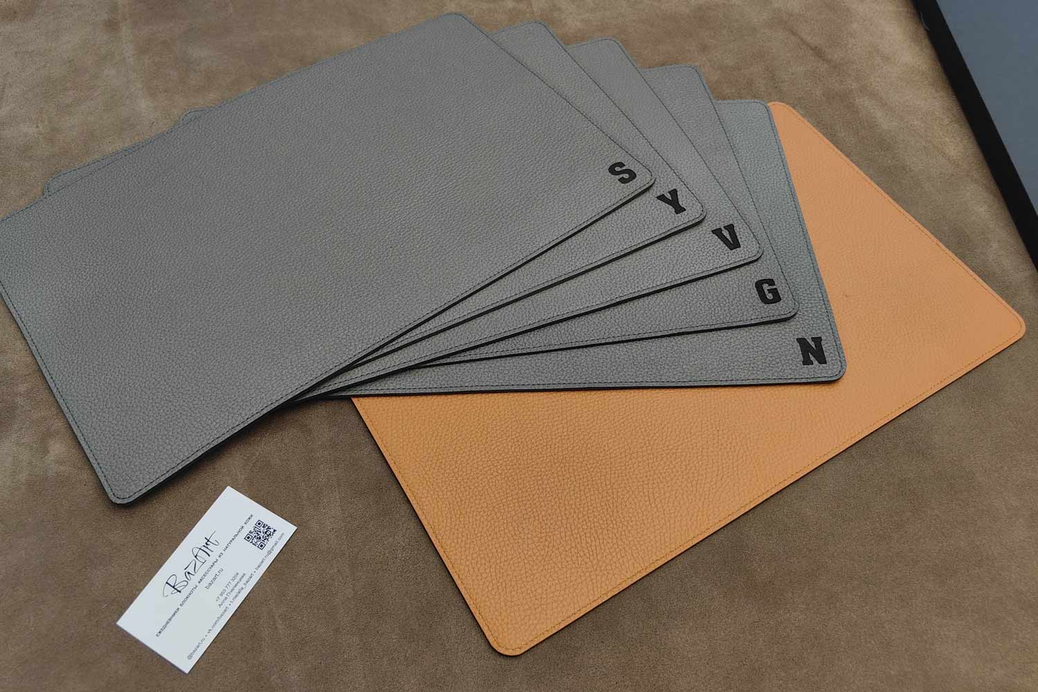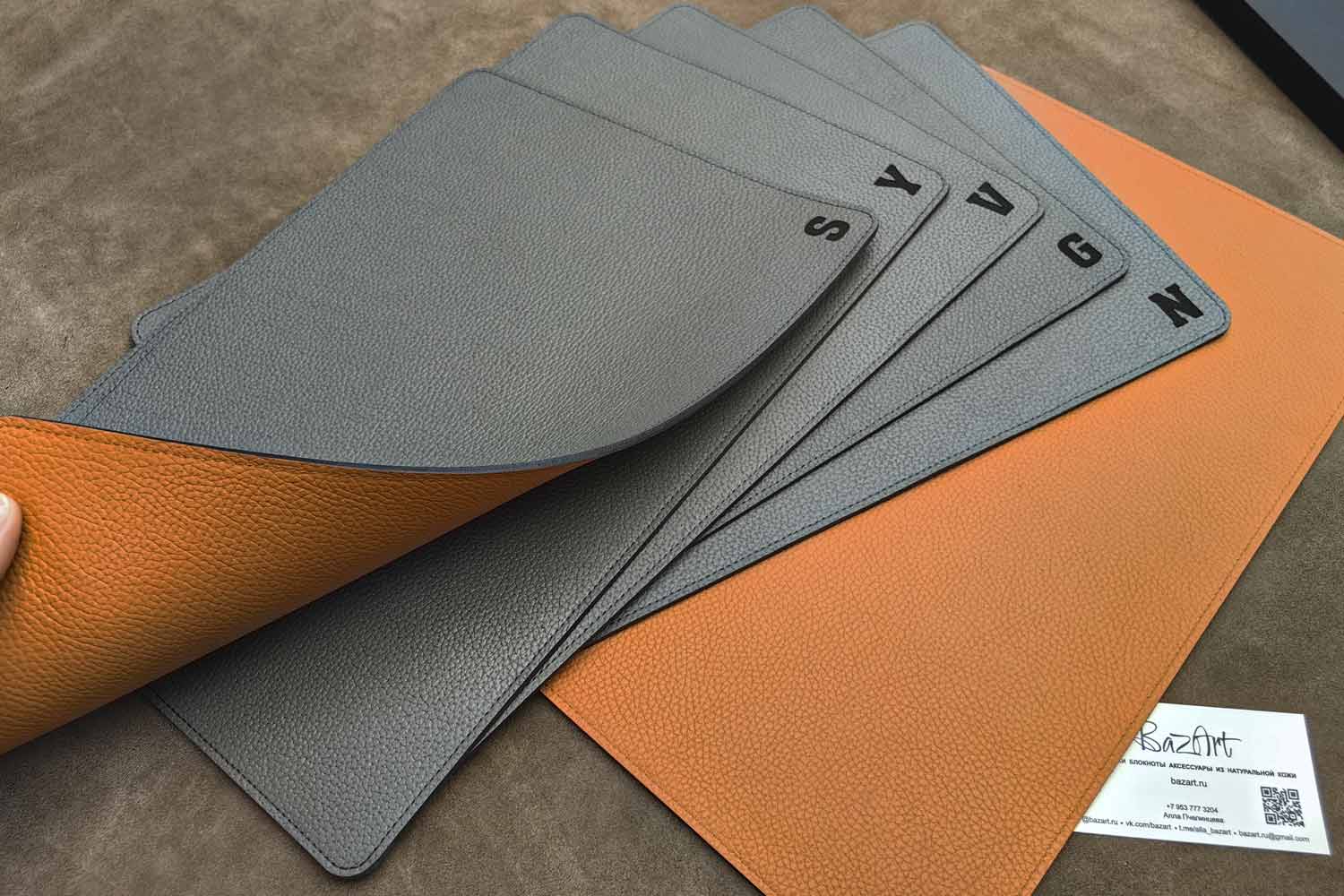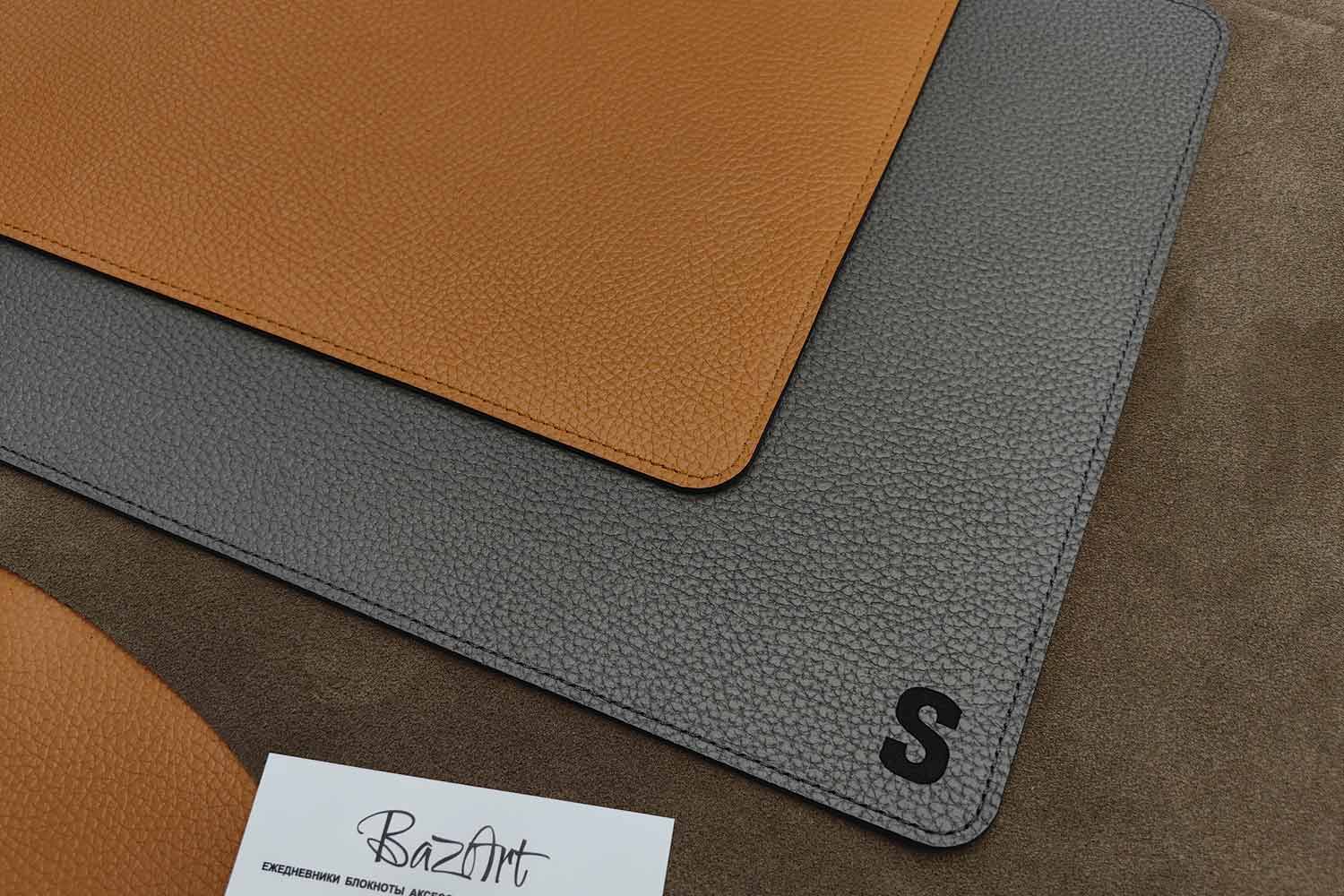 Кожаный плейсмат, сервировочная салфетка из двух слоев кожи. С одной стороны серая кожа, с другой оранжевая. Красивое сочетание, две рабочие стороны.