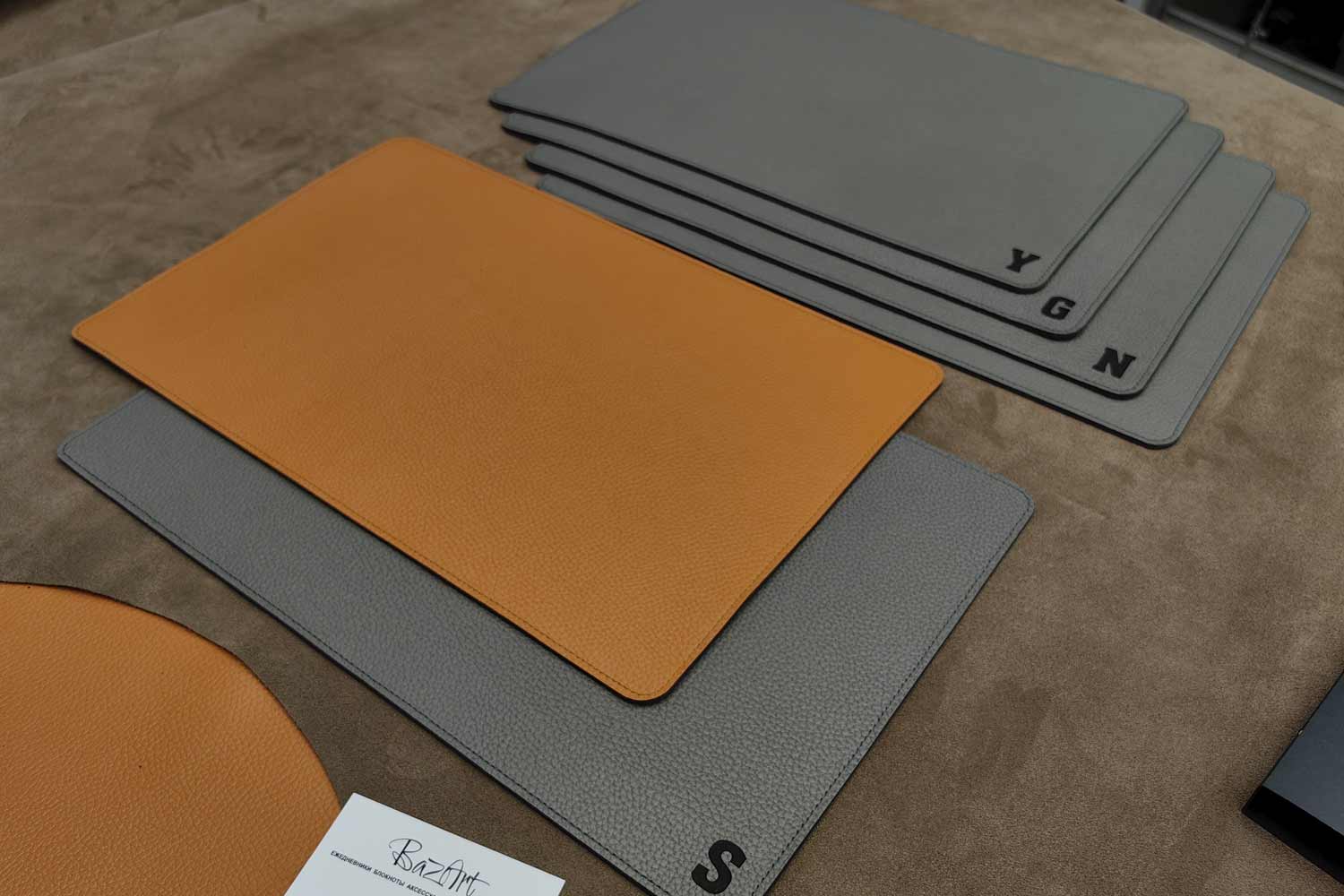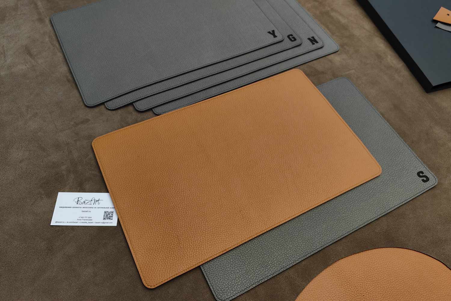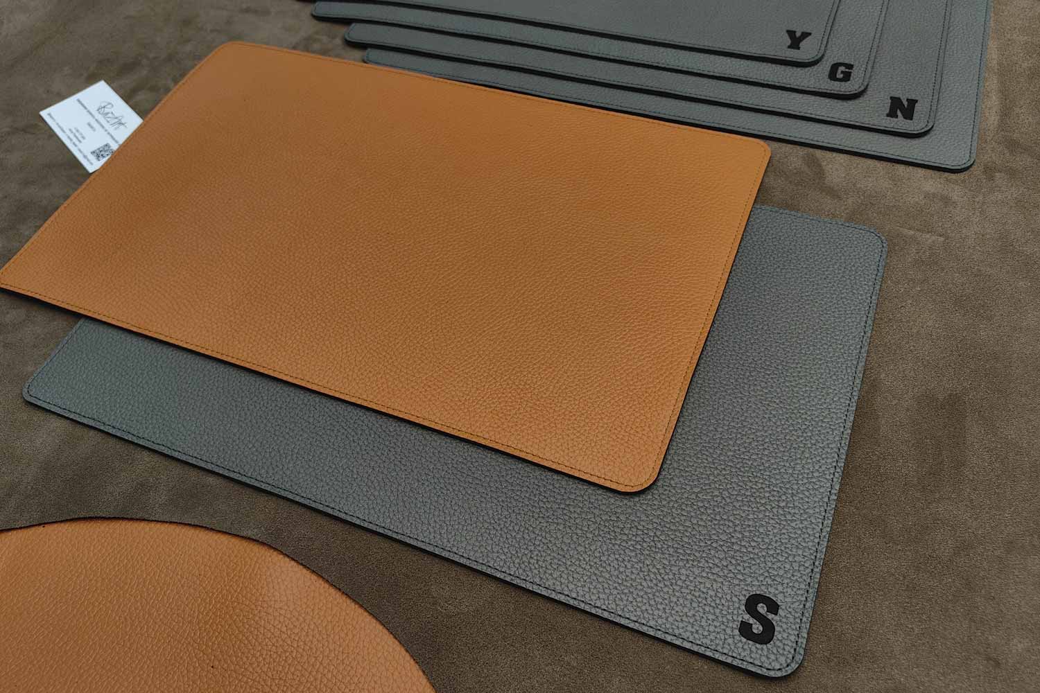 Кожаный плейсмат, сервировочная салфетка из двух слоев кожи. С одной стороны серая кожа, с другой оранжевая. Красивое сочетание, две рабочие стороны.