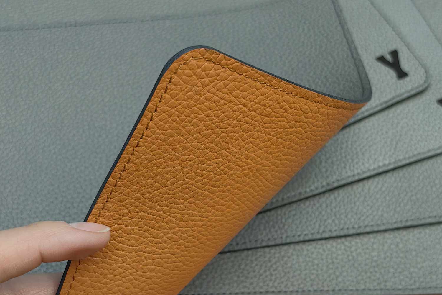 Кожа КРС, флотер, фактурная, с хорошим покрытием, устойчивая к внешним воздействиям. Прошитые края, обработанные и отполированные торцы.