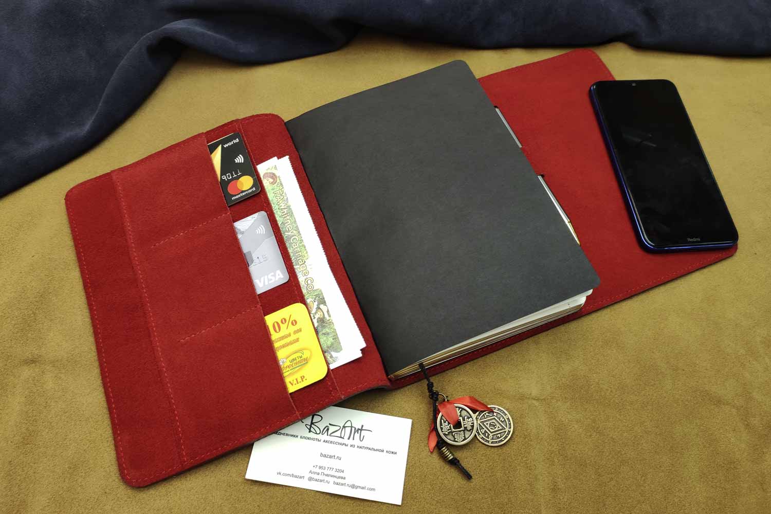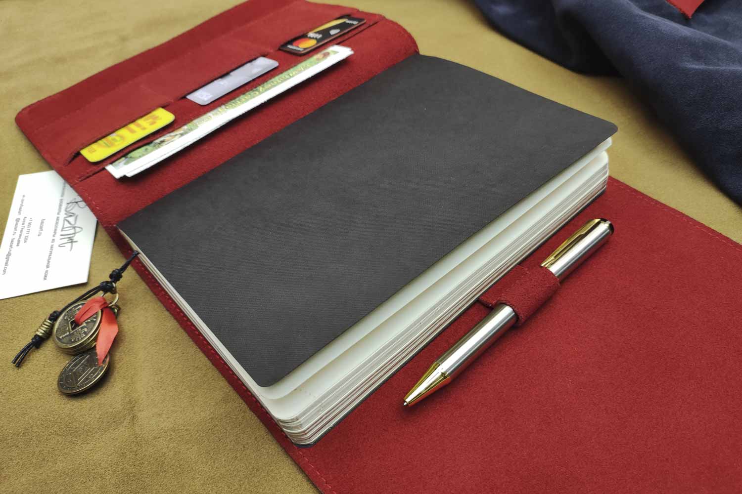 По вашему запросу можно изменить цвет замши, наличие кармашков и петельки для ручки, страницы.